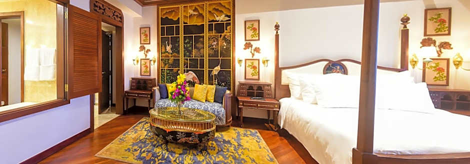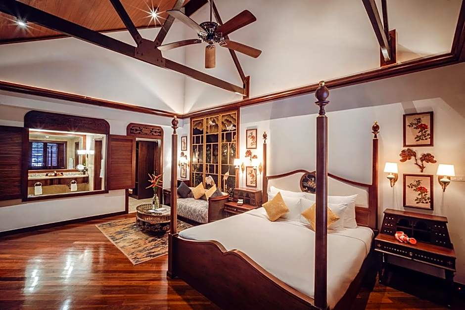 Luxurious suite features a split-level layout and a seating area with L-shaped sofa. The suite is decorated with beautiful local artifacts.